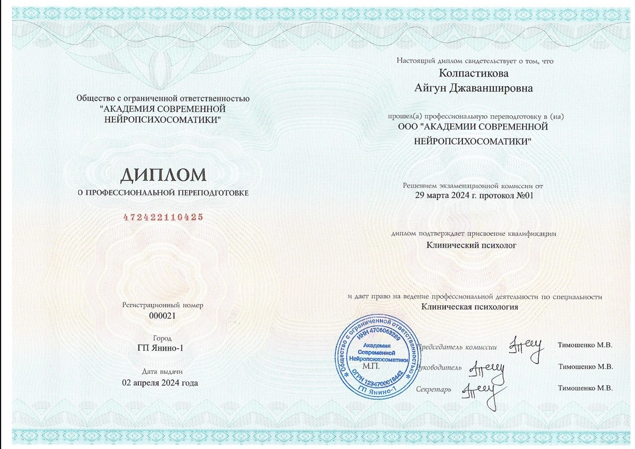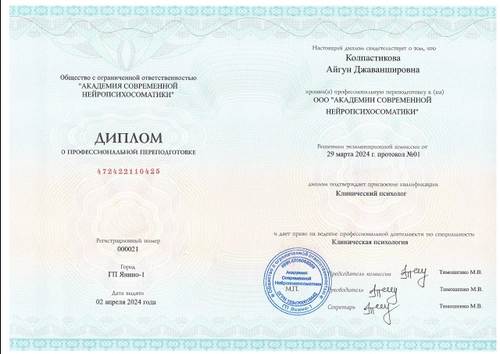 Высшее психологическое образование, сертифицированные курсы по детской психологии и семейной терапии.